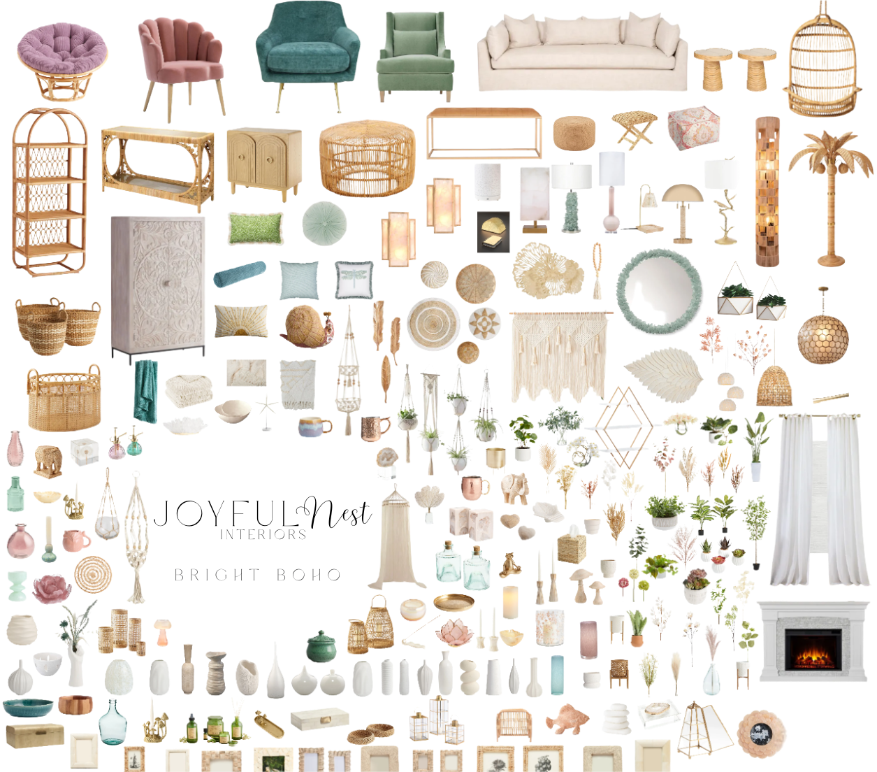 This Bright Boho living room design was developed as a complete, purchasable room concept, using light, color, and layered texture to create a space that feels uplifting, energized, and welcoming — without tipping into chaos or trend-driven design.